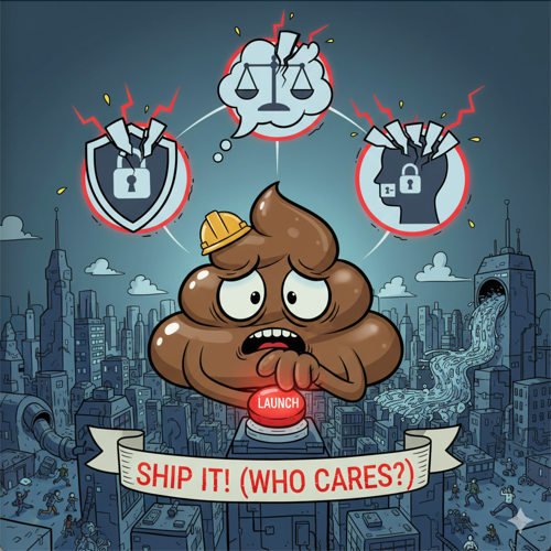Except here? I think I’ve been sensing this happen a lot more. And it’s this. Mostly people just do not give even a little s$#$ about consequences any more. Not really. They want to ship fast and just assume or try to insure away risk. Or maybe they do care, but they’re more afraid of missing out. The vibe is “second place just means you’re the first loser,” and ethics and governance take time. That pressure has been building for years. Yes, some teams check boxes in press releases, but across tech, the mantra is still execution and speed. Ship. Iterate. Call it “efficiency” if you want. Either way, more garbage gets tossed out to see what sticks.