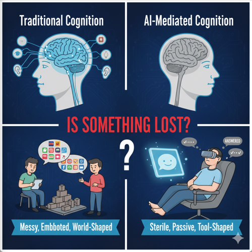 That’s a provocative way to reinterpret the risk: the worst-case outcome isn’t that AI makes us “dumber” overnight. It’s that it reshapes our context so that we do fewer of the embodied behaviors that generate insight, fewer reps, fewer struggles, fewer mistakes we can feel and correct. In that sense, cognition is not just what the brain computes. It’s what the whole human does in a world of constraints.