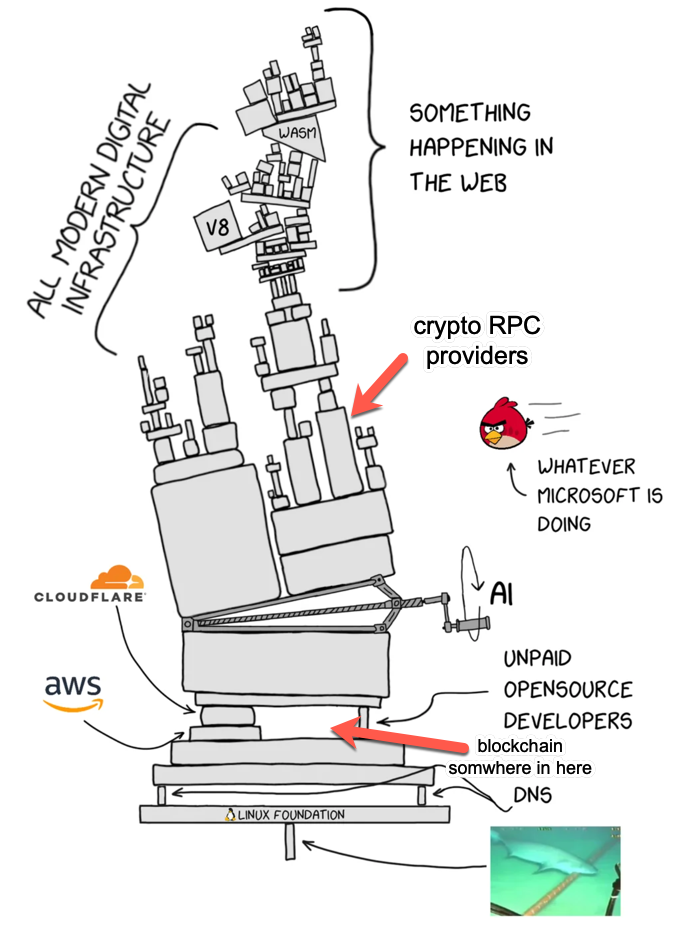 I’m not trying to bust chops on crypto here. I think blockchain may help fix some of this. But as crypto rails go mainstream, teams should learn from existing infra failures. Many “decentralized” components still rely on the same centralized network and transport layers.